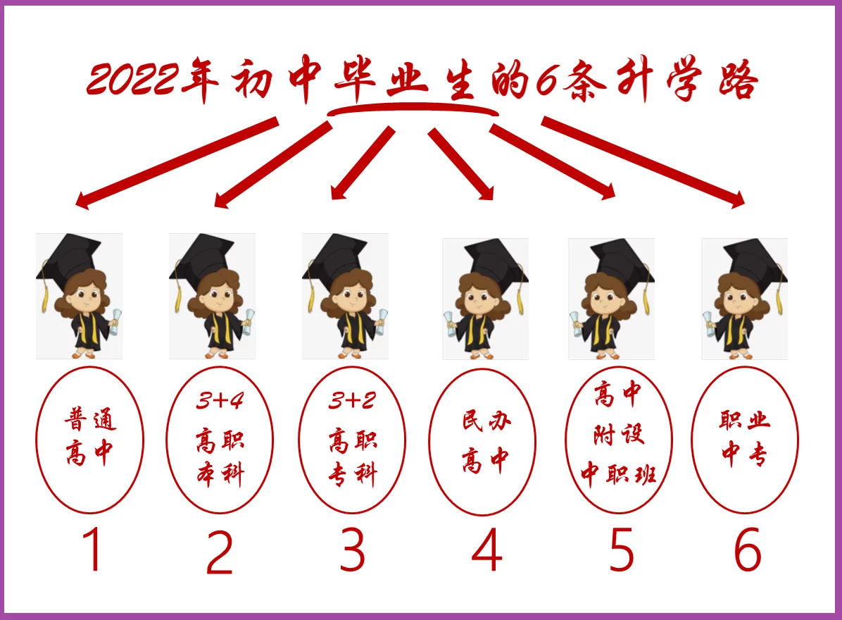 一是普通高中,二是3+4高职本科,三是五年一贯制和3+2高职专科,四是民办高中;五是普通高中附设中职班,六是职业中专。如果努力,这6条路,每一条都通向硕士、博士!