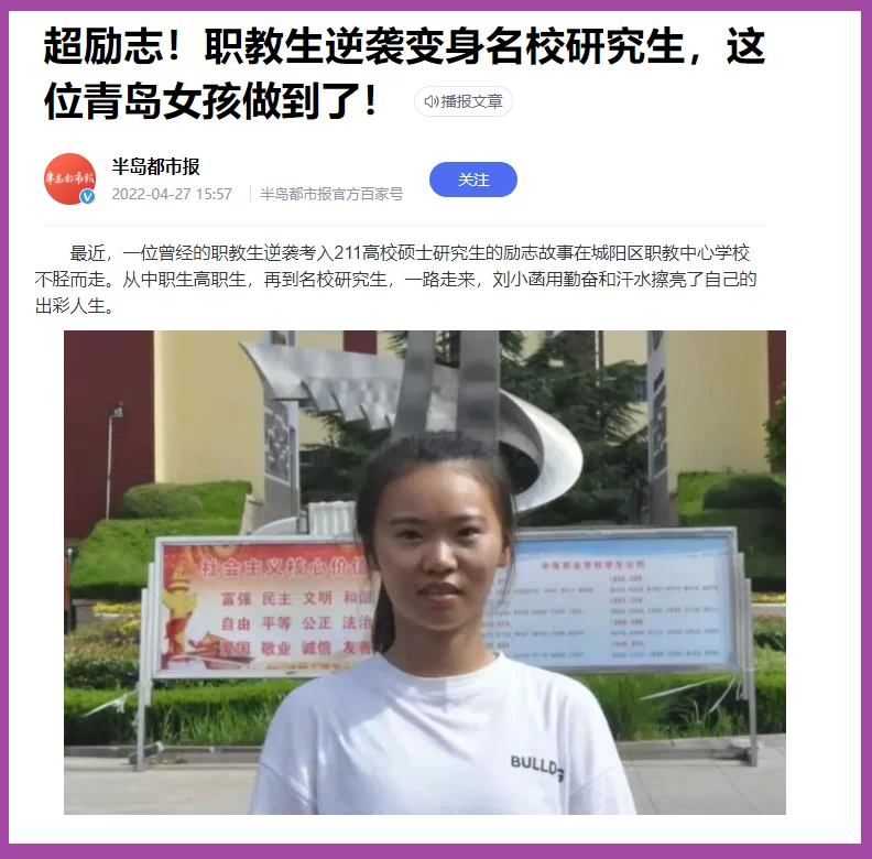 就在我们泰安,被北京林业大学录取为硕士研究生的泰山学院女生刘小菡,也是一位中职生。2015年,刘小菡中考普高落榜,进入青岛城阳区职教中心学校国贸专业。2018年参加春季高考,进入泰山学院学习,2022年研考,被北京北京林业大学林学院农业工程与信息技术专业录取。