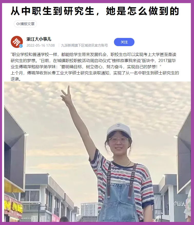 今年被长春工业大学硕士研究生录取的浦江姑娘傅璐萍,同样也是中职生。2014年,傅璐萍中考失利,到义乌市城镇职业技术学校读了中职。2017年毕业后考入宁波大学,2021年决定考研,但却以3分之差没有被录取,2022年再战成功上岸!(5月16日,浙江大小事)