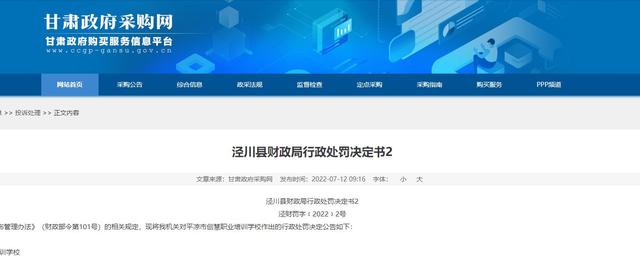 7.21日讯,近日甘肃政府采购网发布一处关于平凉市创慧职业培训学校作出的行政处罚决定公告。