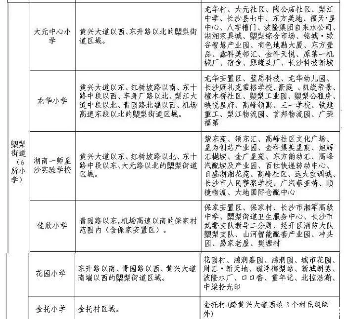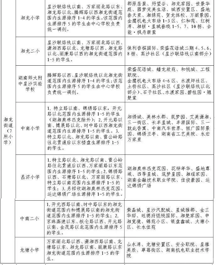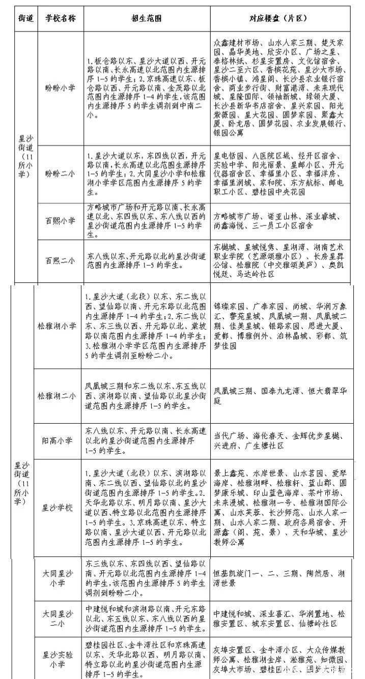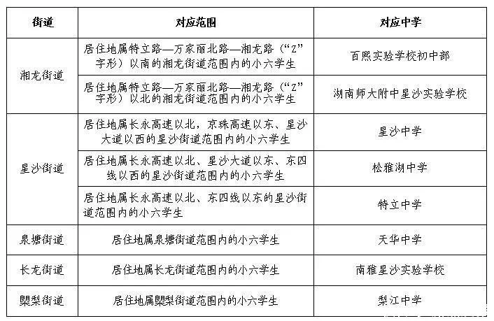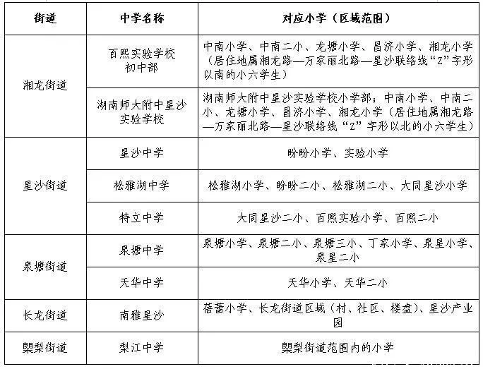 在城区街道内小六学生升初中入学,《办法》表示城区星沙中学、松雅湖中学、特立中学、百熙实验学校初中部、湖南师大附中星沙实验学校、泉塘中学、天华中学、南雅星沙实验学校、梨江中学9所初中学校原则上实行单校划片、多校划片和相对就近、适当调剂相结合的招生原则(班额控制在55人以内),按以下学区划分到对应中学就近入学。具体划片安排为: