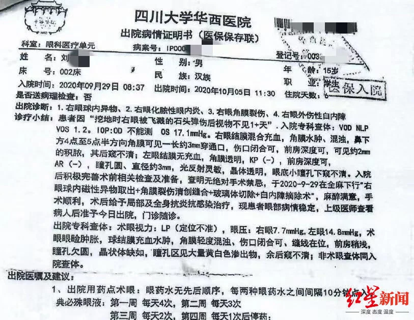 不过,眼药水并未缓解伤情。小刘第二天起床后就发现眼前一片白,看不见了。之后,在同学陪同下,小刘先后到双流区人民医院和四川大学华西医院就诊,但最终未阻止不幸的发生,小刘右眼失明了。