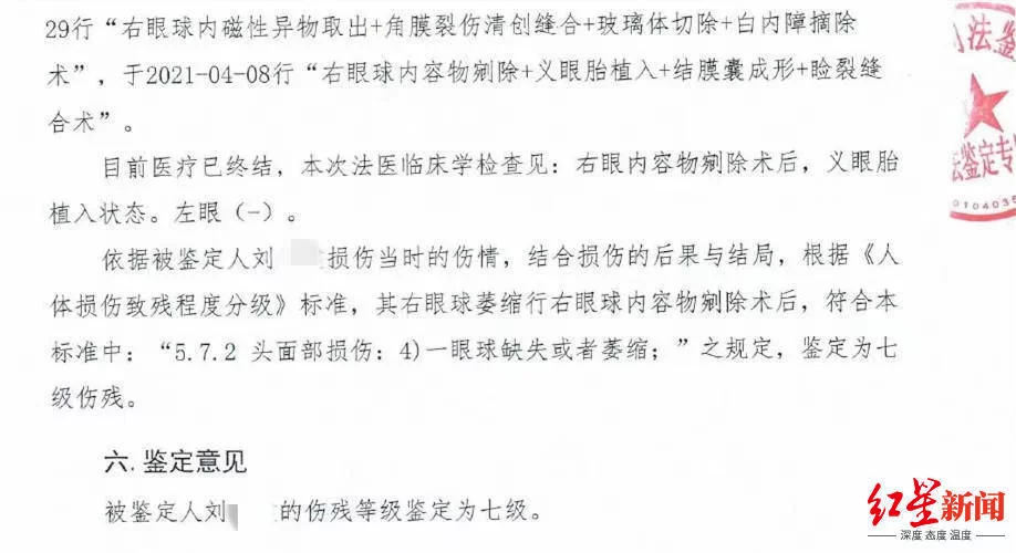 2021年4月,家长带小刘前往司法鉴定中心进行伤残鉴定。据四川鼎诚司法鉴定中心出具的鉴定意见显示:小刘的伤残等级为七级。家长认为,如果校方在第一时间就带孩子到正规医院进行救治,取出异物,也不至于失明。她认为,校方存在不当责任。