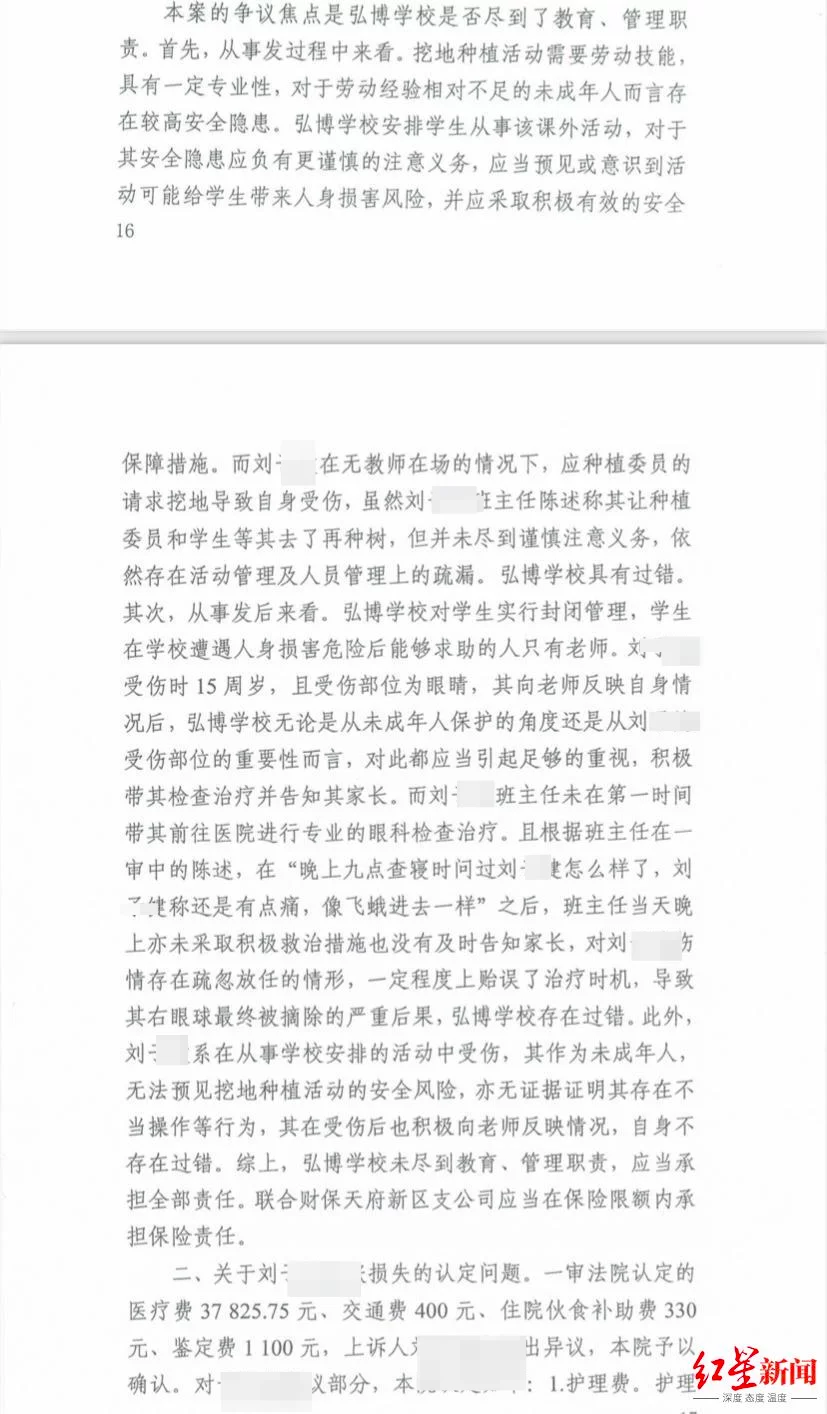 2020年9月27日下午,在四川省弘博中等专业学校(以下简称:弘博学校)就读的小刘在学校农场锄地时,不慎被异物伤及右眼,并最终导致失明。司法鉴定机构出具的鉴定意见显示,小刘伤残等级为七级。(点击查看红星新闻此前报道:16岁少年学校锄地致右眼失明案一审宣判:校方未完全尽责,担责70%)