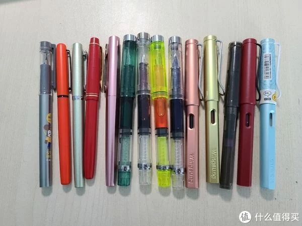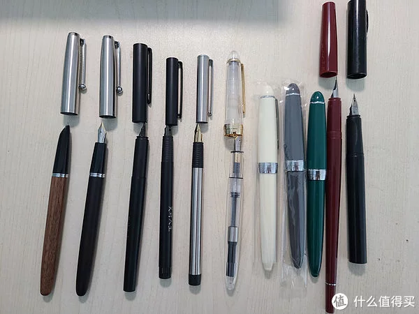传人、永生、派利,这里型号就不写了,有5支我自己把笔夹卸掉了,各种狩猎者外观。部分型号有留白飞白问题,部分有经常放置一小段时间干墨不出水情况,我个人并不推荐,虽然便宜,14支总价可能也就五六十,但,除了两款金属壳的做工不错,其他几款真的就比较一般了,唯一优势就是:便宜!所以,我都装了彩墨给孩子画画用了。