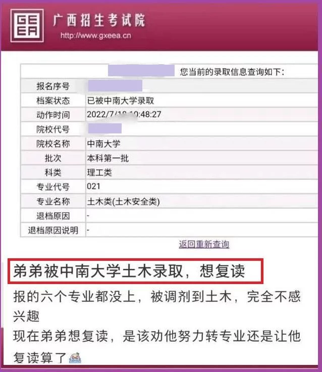 大学通知发放季,一则弟弟被中南大学土木录取,想复读的帖子出现在社交平台上。发帖者说,弟弟今年高考,想学电子信息类或计算机类专业,但报了6个,都没有录取,最后被调剂土木类专业,现在考虑是否回去复读。