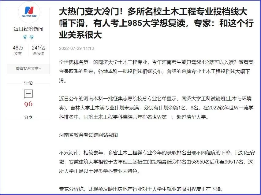 全世界排名第一的同济大学土木工程专业,今年河南考生或只需564分、位次43252就可入读;而去年,同济大学在河南的调档最低分是667分,位次1730,这比去年低了103分,位次则低了41522,我们在羡慕今年564分考生捡漏的同时,更慨叹今年土木专业热温的骤降。