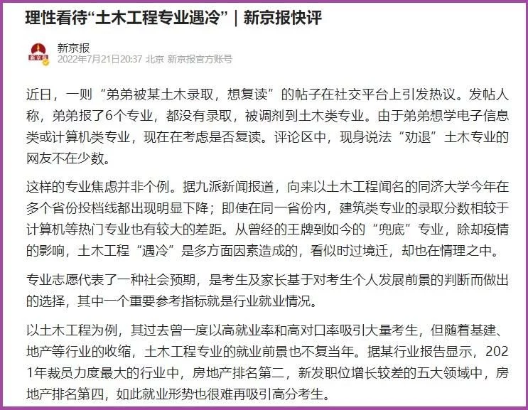 此种严峻形势下,土木专业准大学生想复读,自然引发了人们的共鸣,本文开头帖子的评论区下,不少网友进行劝退。