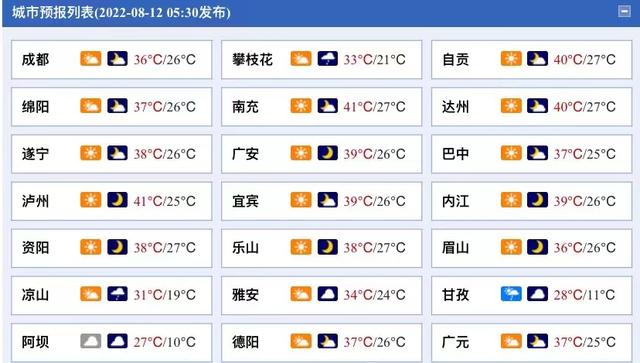 四川气象:今天白天:我省大部晴间多云,其中盆地西部沿山、甘孜州北部西部及攀西地区大部多云间晴有分散阵雨或雷雨。24小时内,盆地最低气温:25~28℃;最高气温:西部36~39℃,其余地方39~41℃。