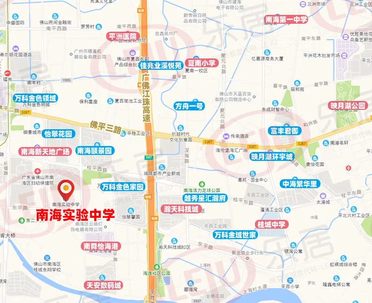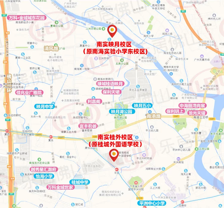 南实桂外校区和映月校区均地处平洲板块,招生范围内涵盖绿城桂语映月、保利天珺、中海丽湾尚宸等新盘,均价2.8-5万/㎡不等。