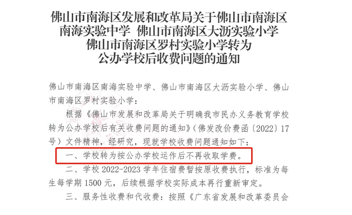 日前,乐居据悉,南海区发改委公布关于南海实验中学、大沥实验小学和罗村实验小学转为公办学校后的收费通知,通知中显示学校转为公办性质后不再收取学费,2022-2023学年住宿费暂按原收费执行。