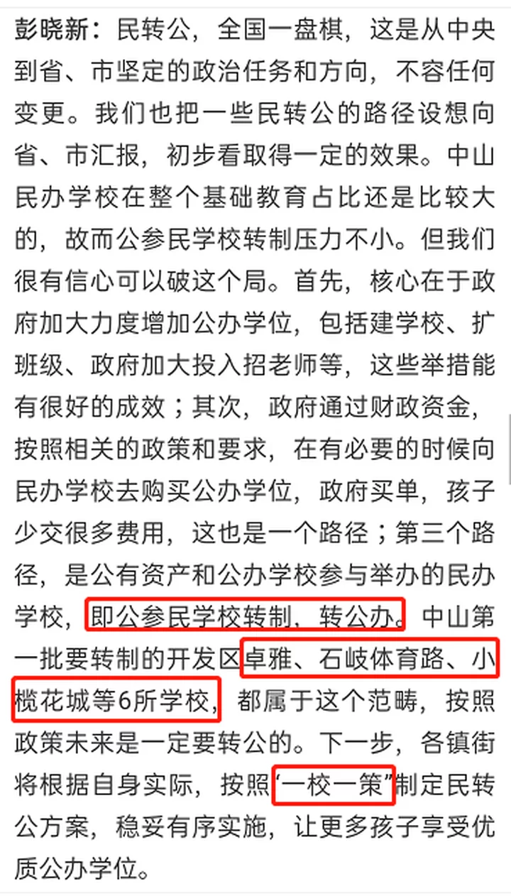 当时他还表示,下一步,中山各镇街将根据自身实际,按照一校一策制定民转公方案,让更多孩子享受优质公办学位。
