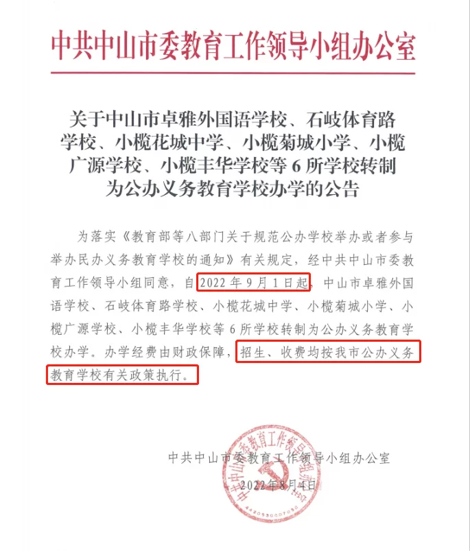2022年8月4日,中山教体局发布公告,中山市卓雅外国语学校、石岐体育路学校、小榄花城中学、小榄菊城小学、小榄广源学校、小榄丰华学校等6所学校转制为公办义务教育学校办学!