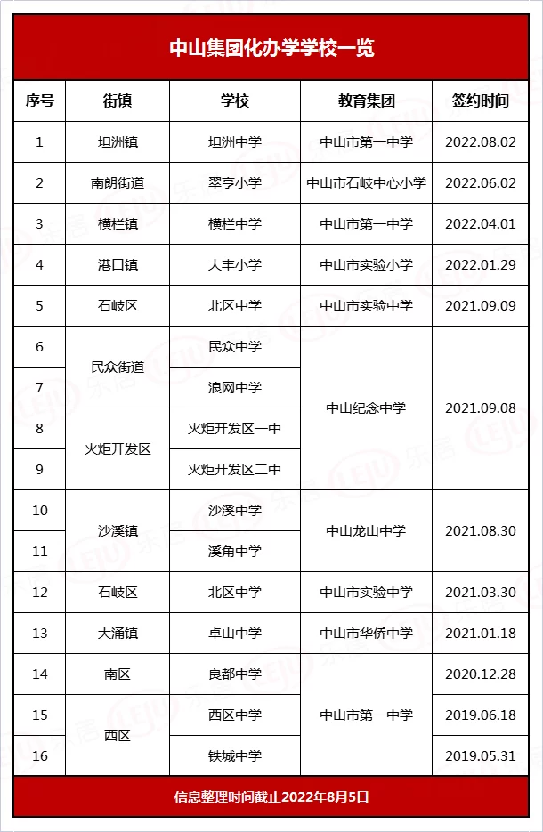 至此,中山已有16所学校签约集团化办学,涵盖小学和中学,具体见下表。
