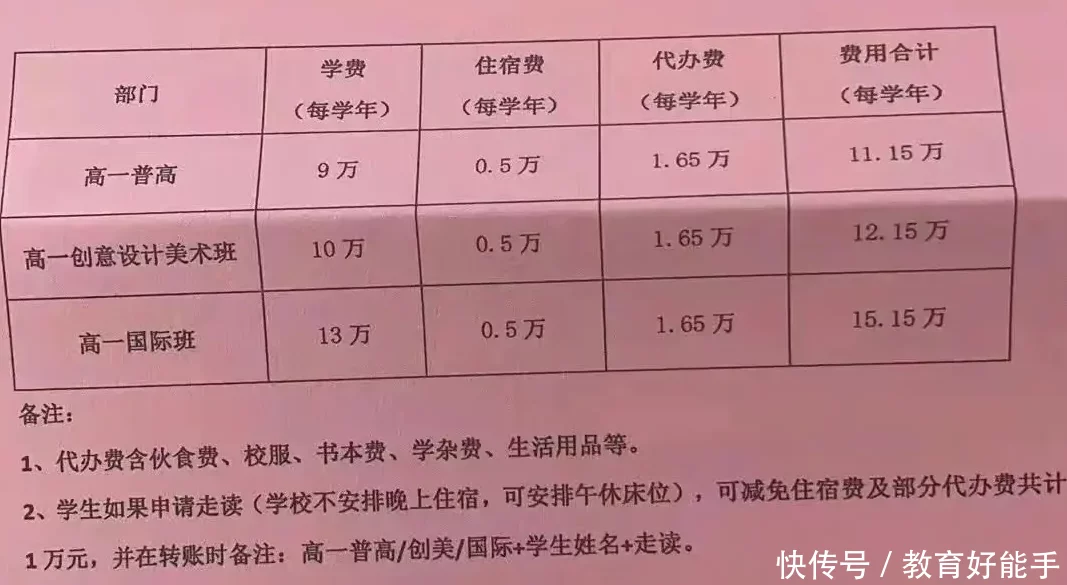 而高一创意设计美术班,每年的学费会相对高一些,达到10万元,住宿费5000元,代办费都是一样的1.65万,加一起12.5万。