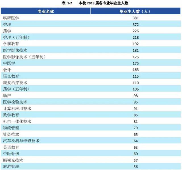 表1:2019年全省高职专科医药卫生大类毕业生人数