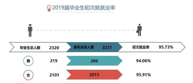 四川护理职业学院2019 年,四川护理职业学院共有全日制三年大专毕业生 2320人,落实去向总人数共计2221人,初次就业率95.73%;男生初次就业率为94.06%,女生初次就业率为95.91%。