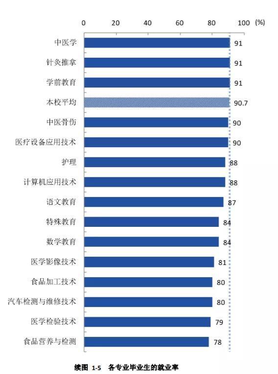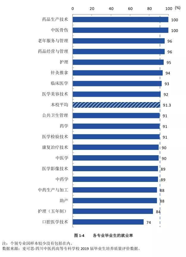 该校 2019 届就业率较高的专业是药品生产技术(100%)、中医骨伤(100%)、老年服务与管理(96%)、药品经营与管理(96%),就业率较低的专业是口腔医学技术(74%)、护理(五年制)(84%)。