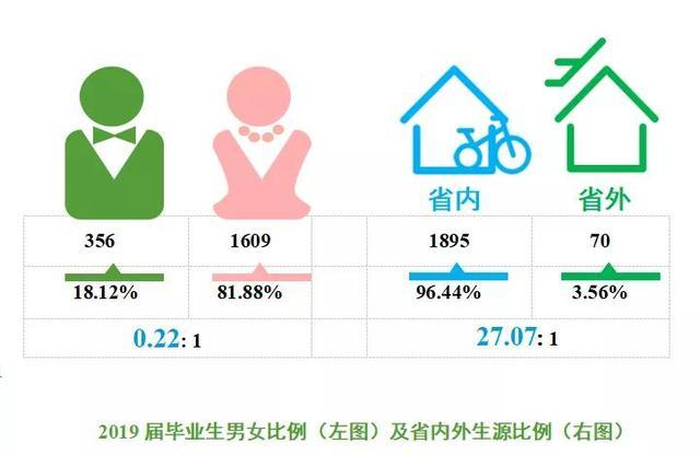 其中,男生356人,占毕业生总人数的18.12%;女生1609人,占毕业生总人数的81.88%,男女性别比为0.22:1,女生比例偏高;省内生源为主,共1895人,占比为96.44%。