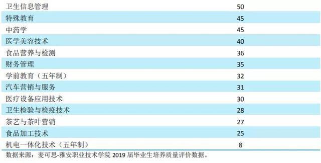 该校 2019 届毕业生中,就业率较高的专业是物流管理、财务管理、助产、茶艺与茶叶营销、 卫生信息管理(均为 100%),就业率较低的专业是食品营养与检测(78%)、医学检验技术(79%)、 汽车检测与维修技术(80%)、食品加工技术(80%)。