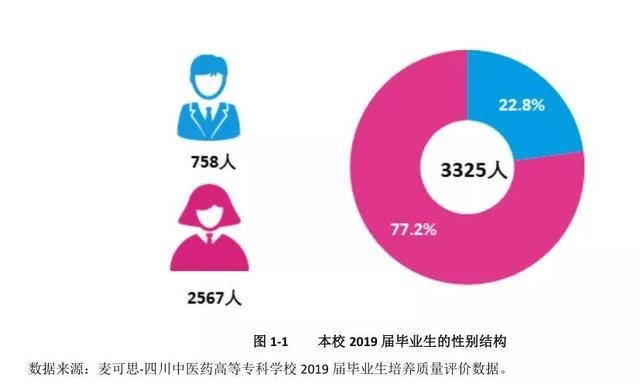 从性别结构来看,该校毕业生女生占比(77.2%)高于男生(22.8%);从学院专业结构来看,本校毕业生主要分布在护理学院、中医学院等 6 个学院,具体分布在护理、临床医学、中医学等 19 个专业。