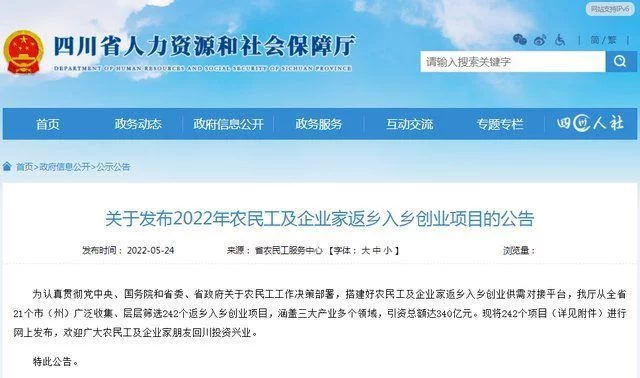 今年,四川省人力资源和社会保障厅将继续以返乡入乡创业项目为支撑,推动雁归天府 创赢未来四川省农民工及企业家返乡入乡创业品牌活动提档升级,携手省政府各驻外办事处和项目所在地政府开展项目推介及项目考察系列活动。下半年还将举办四川省2022年农民工及企业家返乡入乡创业项目推介暨集中签约活动。
