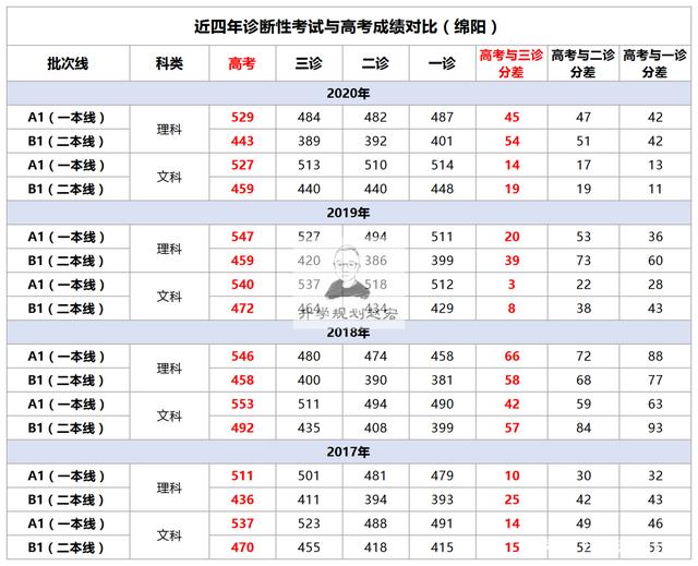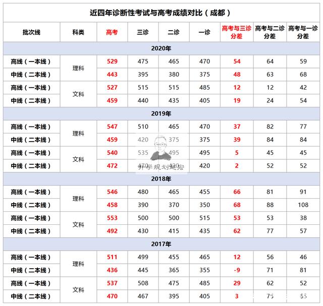 2021年的成都二诊正在考试中,绵阳二诊以及结束了,多个地方的诊断考试也差不多到中途接近尾声了;那么历次诊断考试的成绩和高考分数差距有多大?那一次诊断考试最接近高考分数呢?本文统计了2017年到2020年成都、绵阳的三次诊断考试划线和高考分数线的对比情况,三诊是最接近高考分数的,二诊是最能代表考生水平的;具体看下文: