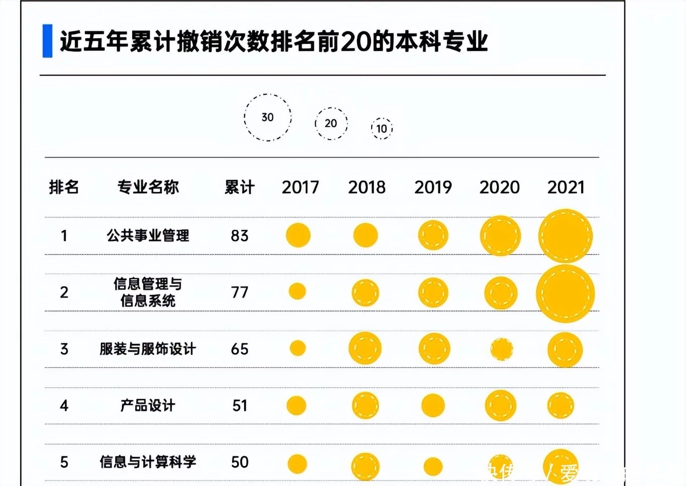 除了公共事业管理专业是撤销最多的之外,对于5年间撤销的专业情况,考生要做到有数,挑选专业期间要尽量避开,信息管理与信息系统专业被73所大学撤销了。