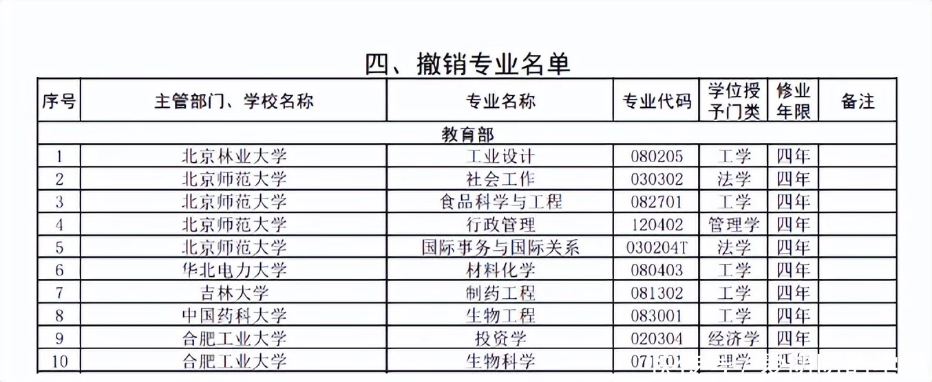 像北京林业大学的工业设计专业就撤销了,北师大撤销了4个专业,分别是社会工作、食品科学与工程、行政管理和国际事务与国际关系。