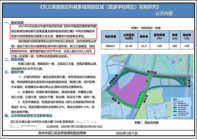 对于该学院的校区建设,苏州市也是十分重视,选址于吴江东太湖度假区苏州湾大道东侧、吴江大道南侧,规划用地约804亩,建筑面积超过28万平方米,总投入超过20亿元人民币,力争将其打造成为一所全国一流、世界知名的旅游职业院校。2021年9月份,该项目正式开启。