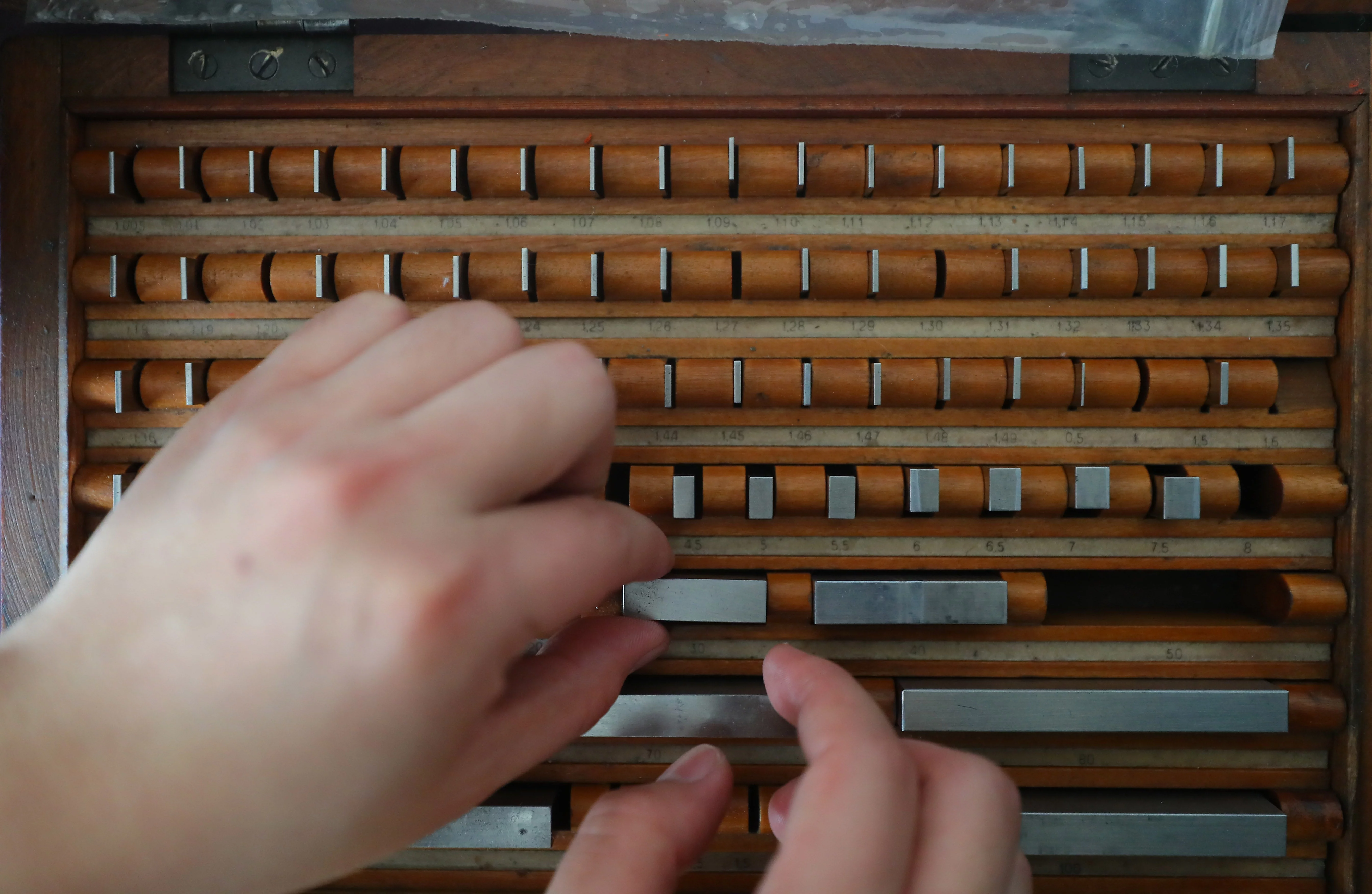 在沈阳飞机工业(集团)有限公司方文墨工作室,青年工人杨国心在挑选量块(4月19日摄)。新华社记者 杨青 摄