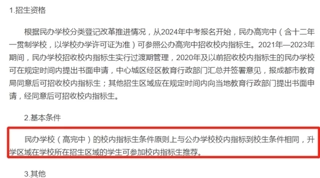 1)私立民办高中招生条件必须与公办学校保持一致,无论是分数线还是各校指标;2)民办高中校内指标必须参考学校,本校的小学和初中不再享受超指标招生;3)私立高中也不能跨区域跨学籍招生。