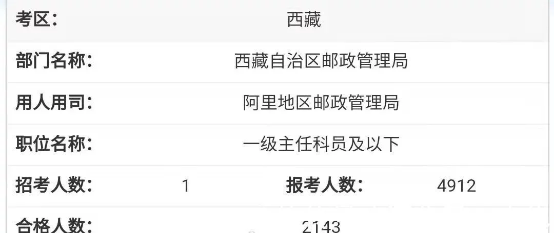 西藏自治区的邮政管理局只招录一人,报考人数达5000人,本来都以为没人报的岗位都有这么多人报考,可想而知竞争有多激烈。