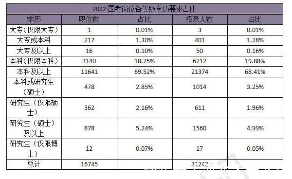 从以上数据中可以发现,在2022年国考的岗位要求中,招收大专学历的岗位非常少,招收率不超过2%,本科及以上的学历占据了国考岗位的大部分,显然可以看出本科学历是国考的主力军,还说学历无用论吗?