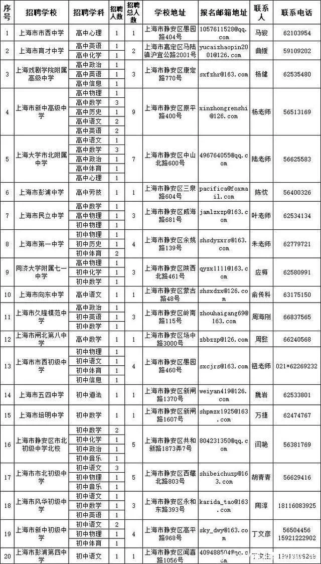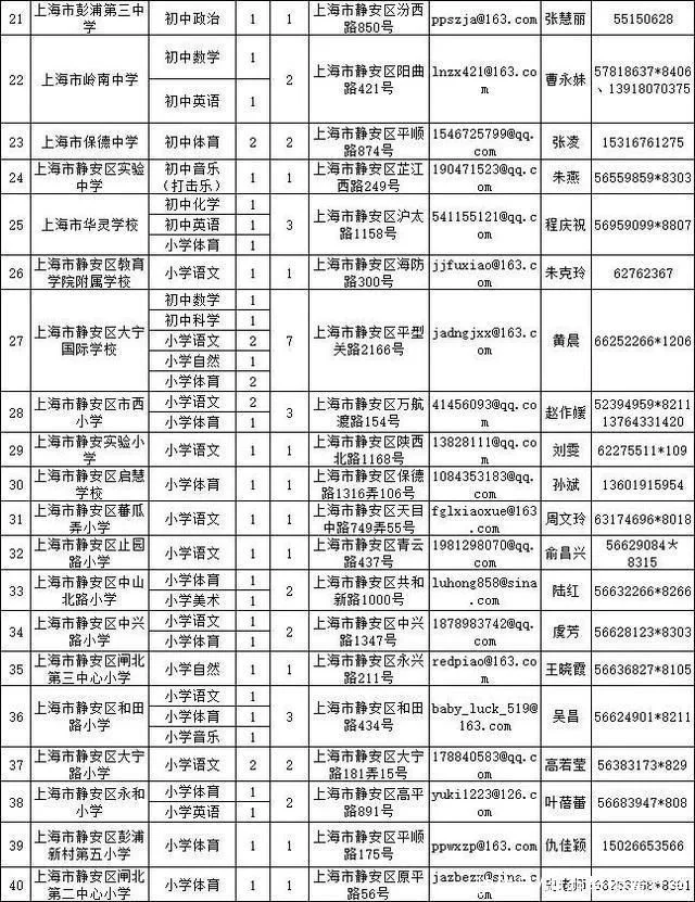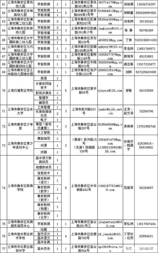 2、查询报名信息及如何报名:(1)相关信息发布在静安门户网站(https://www.jingan.gov.cn/)上。(2)通过区教育人才服务中心网站(http://www.jajyrc.edu.sh.cn/),各学校网站查看招聘岗位、报名联系方式等信息。(3)参照下方招聘岗位表格直接与学校电话联系。2022年(第三批)招聘岗位