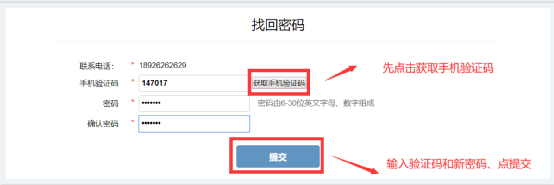 步骤3:通过注册时绑定的家长手机号,获取手机验证码,并输入新的密码,点击提交按钮,如下图: