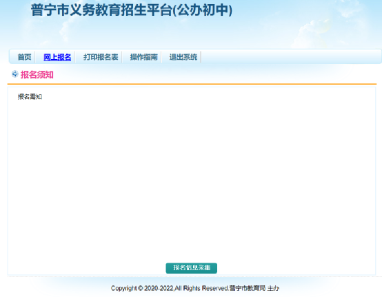 在进入报名信息填写之前,用户须先阅读网上报名、现场资格审查需提供资料及注意事项,不同年级或不同报名通道的报名须知内容有所不同,请用户认真、仔细阅读,并按报名须知填写报名信息和准备现场审核所需材料。阅读完毕后,点击报名信息采集按钮进入报名信息填写页面,如下图: