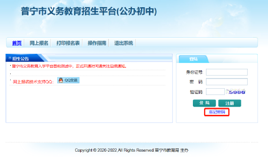 用户忘记密码无法登录系统时,可在报名登录网页中登录窗口的下方点击找回密码链接,通过注册时绑定的家长手机号接收验证码,并通过系统验证后重置密码。