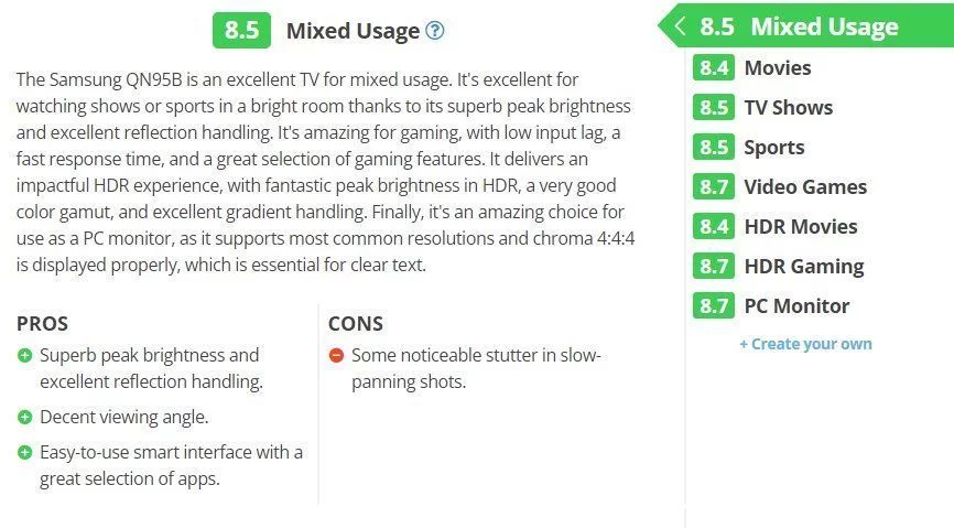 三星QN95B有着优秀的综合使用性能,拥有优秀的峰值亮度和抗反射处理,非常适合在明亮的房间观看体育/电视节目;它的游戏性能表现是惊人的,具有较低的输入延迟、快速响应时间和大量与游戏相关的子功能;它拥有颇具冲击力的HDR体验,拥有理想的峰值亮度、极好的色域和色阶梯度处理;它也是一款出色的PC显示器,因为它支持最常见的分辨率,以及4:4:4色度,这对于显示文本来说至关重要。