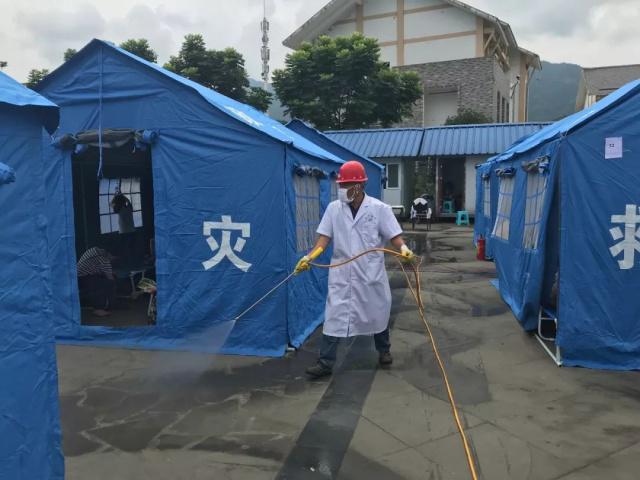 6月18日14:27分,震中双河镇的避难广场上,疾控人员正在对环境进行消毒杀菌。