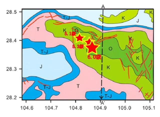 长宁背斜构造和2019年6月17日四川长宁6.0级地震序列5级以上地震分布