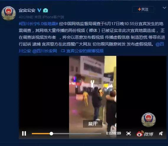 四川宜宾公安局官方微博发布消息称,经调查确认,网络大量传播的两段视频(裸体)已被证实非此次宜宾地震造成, 正在调查该视频发布者 ,将会以涉嫌恶意发布假视频、传播虚假信息、制造恐慌等罪名进行起诉,宜宾警方在此提醒广大网友,切勿跟风随意转发,发布虚假视频。