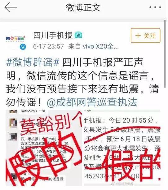17日23时57分四川手机报官方微博@四川手机报发布辟谣:微信流传的信息是谣言,我们没有预告接下来还有地震,请勿传谣!