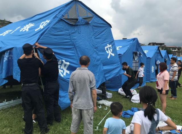 6月18日13:35分,震中长宁县双河镇双河中学内的操场上,一个规模更大帐篷临时安置区正在形成,上百顶帐篷整齐地架设在绿草坪上。