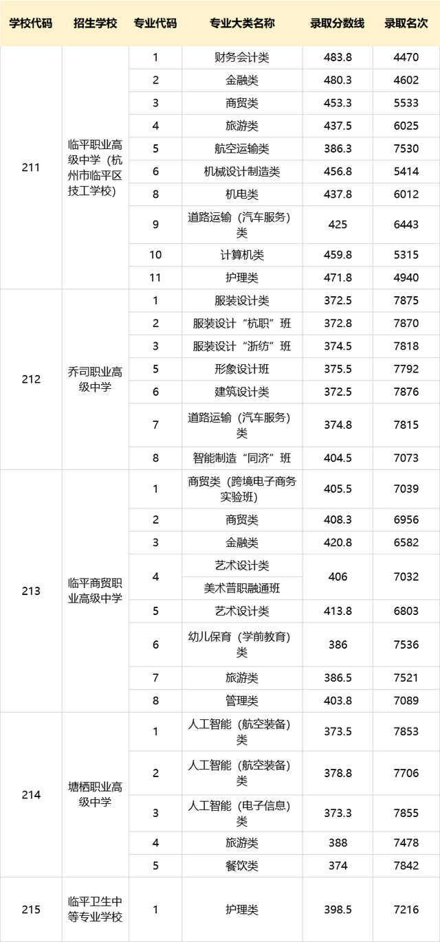职高学校中乔司职高的服装设计类、服装设计浙纺班、道路运输类,塘栖职高的人工智能(航空装备)类、人工智能(电子信息)类、旅游类、餐饮类未招满,其余职高及相关专业第一批次均已招满,除乔司职高的服装设计类外剩余计划数纳入到第二批招生计划数中。