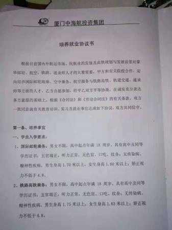 上述王同学还称,入学后,他曾按校方要求到厦门中海航投资有限公司指定的厦门安防科技职业技术学院培训三次,共15天,考证费、住宿费等费用共计7300元。王同学提到,支付高昂培训费后,他发现在厦门的培训内容其实与贵州航天职业技术学院所学并无区别。