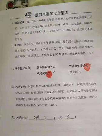据其介绍,2016年他曾花费7300元赴厦门完成为期15天的高铁乘务员技能培训,2017年正常完成学业后,但并未在毕业时如愿成为高铁乘务员,安排的岗位都是地铁的安检安保、高铁站搬运工等等。