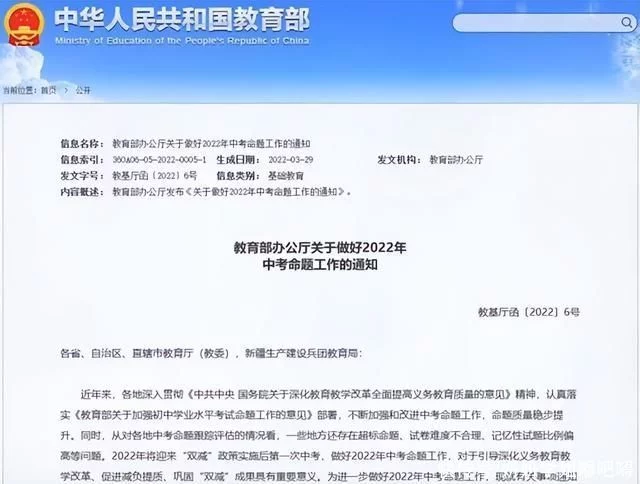 教育部在发布的文件中,提到了对中考命题的调整,此次中考改革,将是近几年中最大的一次,针对2022年中考命题工作的通知,有五大重要变革,学生和家长要提前做准备。
