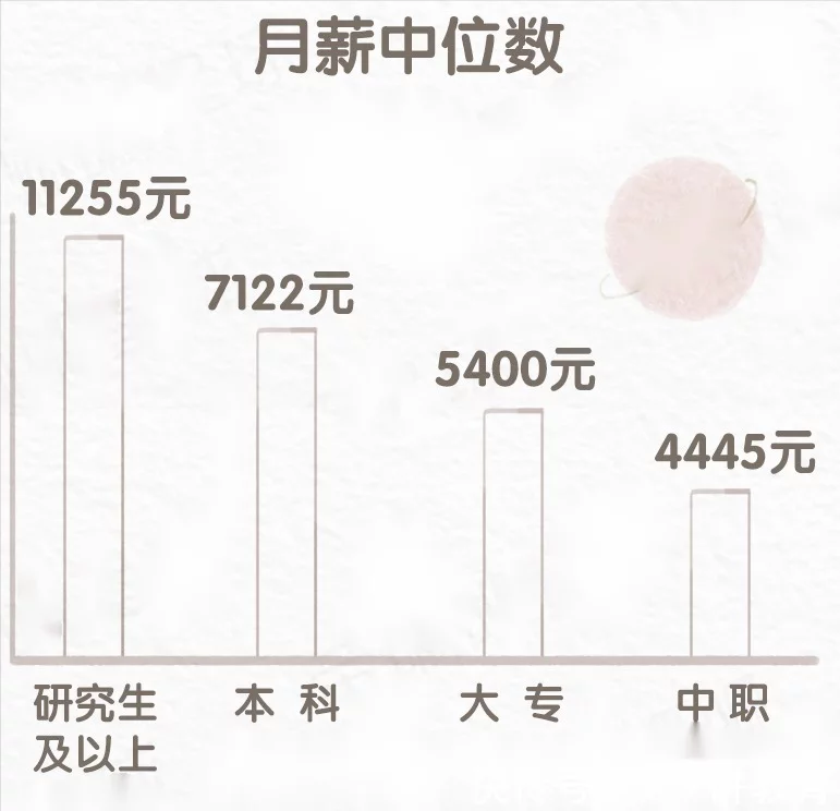 我们再来看一份更为清晰的数据吧,在这份数据中,中职生的收入中位数是4445元,比大专生低了将近1000元,比本科生和研究生更是低了很大一截。