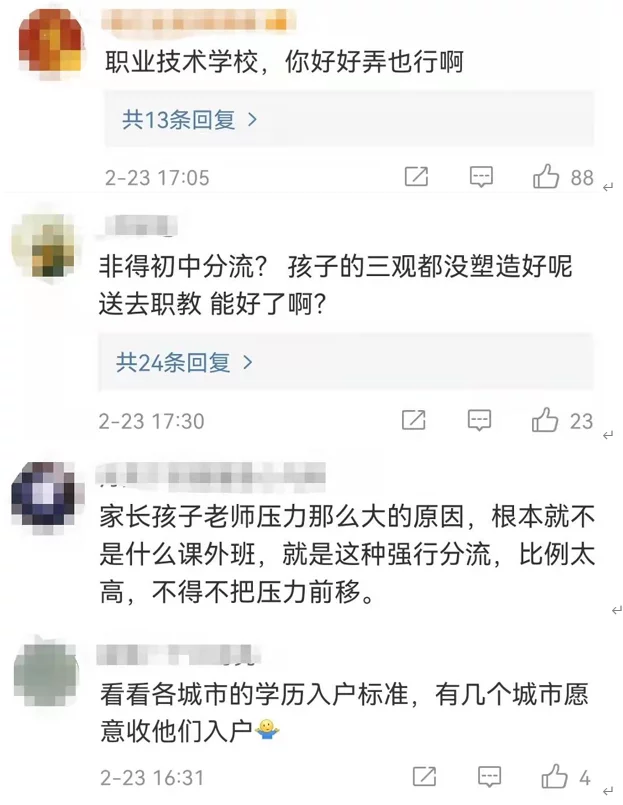 教育部职业教育与成人教育司司长陈子季也做出最新回应,称义务教育后实行普职分流非常必要,并表示会合理规划中职学校和普通高中的招生规模,提升中职办学条件。